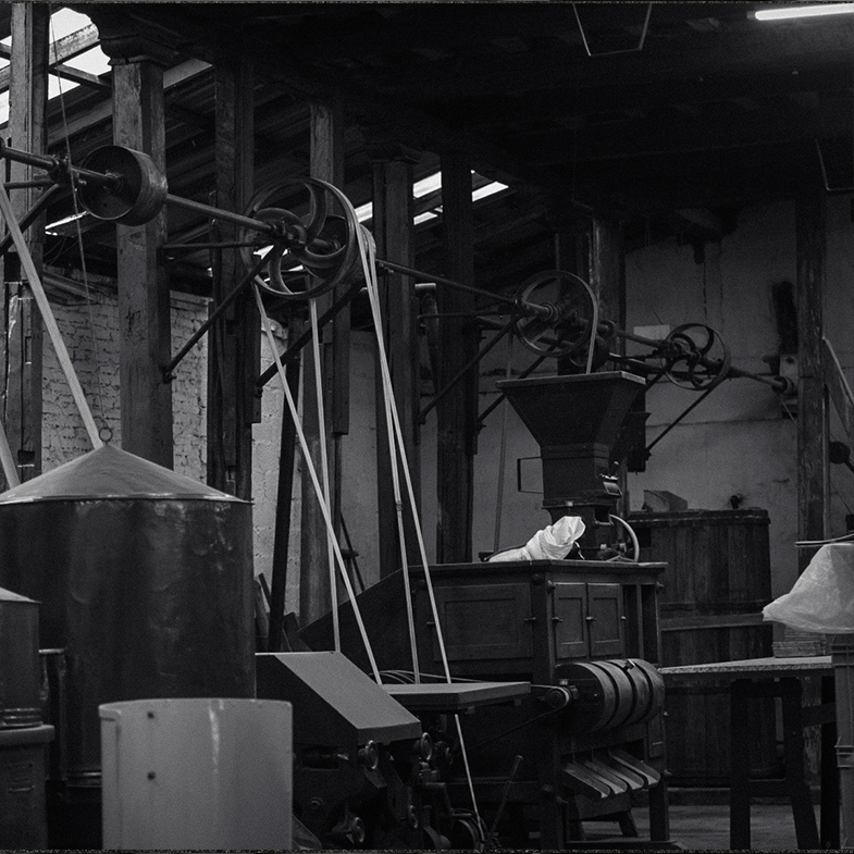 o más especial es que esta tostadora opera conectada al sistema original de poleas y transmisión de la fábrica, el mismo mecanismo que ha movido la producción por más de un siglo (en uso desde aproximadamente 1915). No es una recreación: es el sistema auténtico, aún en funcionamiento, que sigue entregando movimiento constante y confiable.